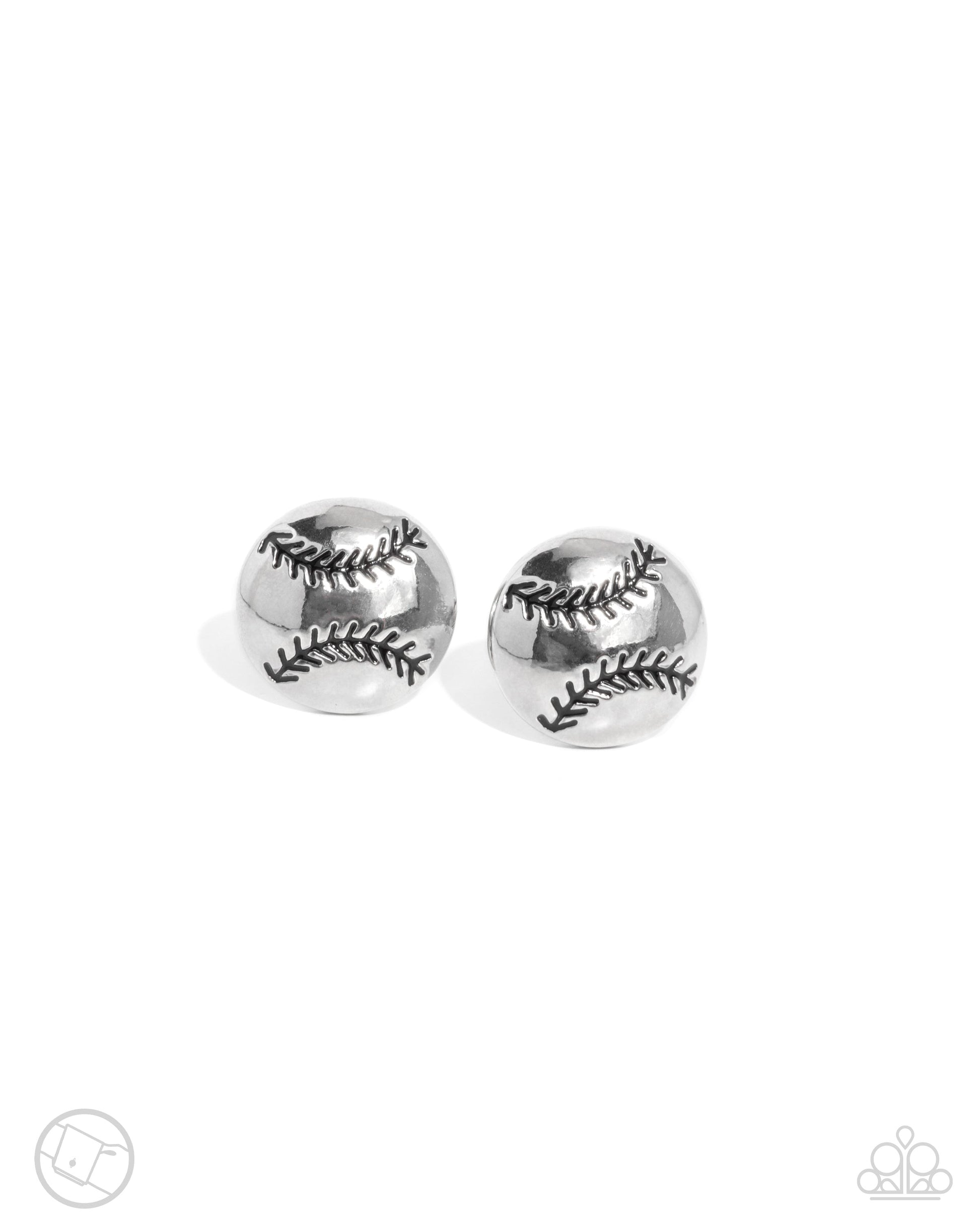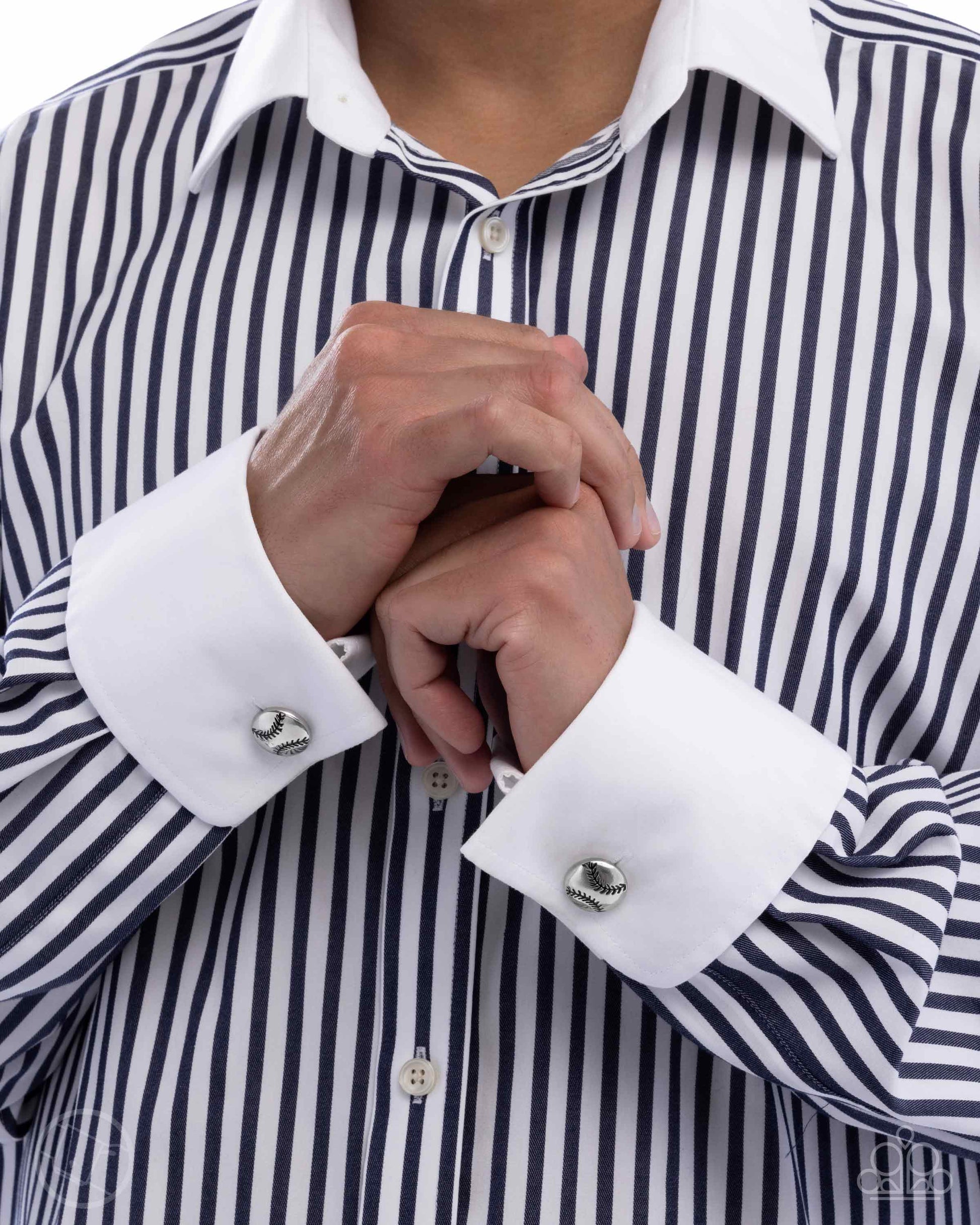 Featuring black-painted figure eight baseball-inspired stitching, a silver sphere cuff link stands out for a competitive sports-inspired cuff link.