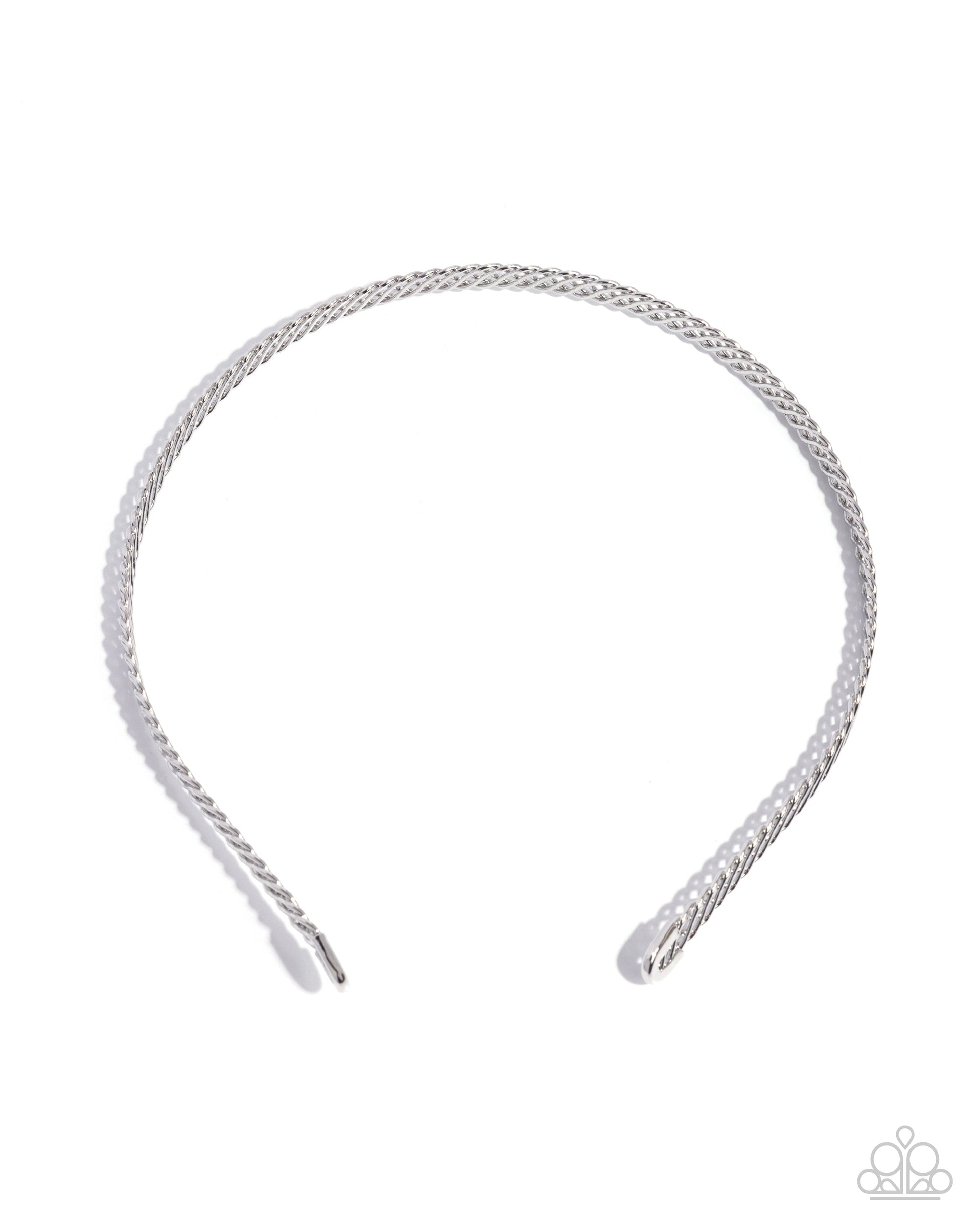 Delicately wrapped around a silver band, a glistening, braided silver ribbon curls atop the head, evoking a polished, preppy look.