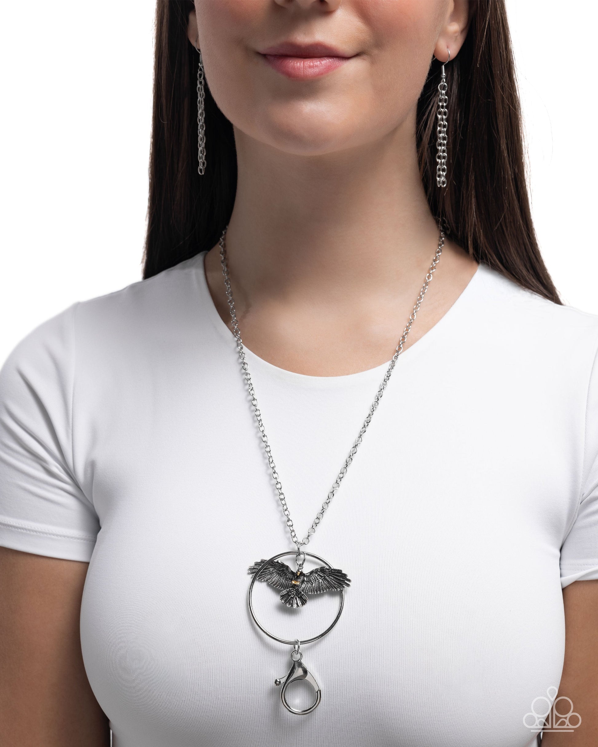 Gliding along an extended silver chain, a highly intricate silver eagle pendant with gold detailing soars against a silver hoop backdrop below the neckline for a free-spirited fashionable look. A lobster clasp hangs from the bottom of the hoop to allow a name badge or other item to be attached. Features an adjustable clasp closure.