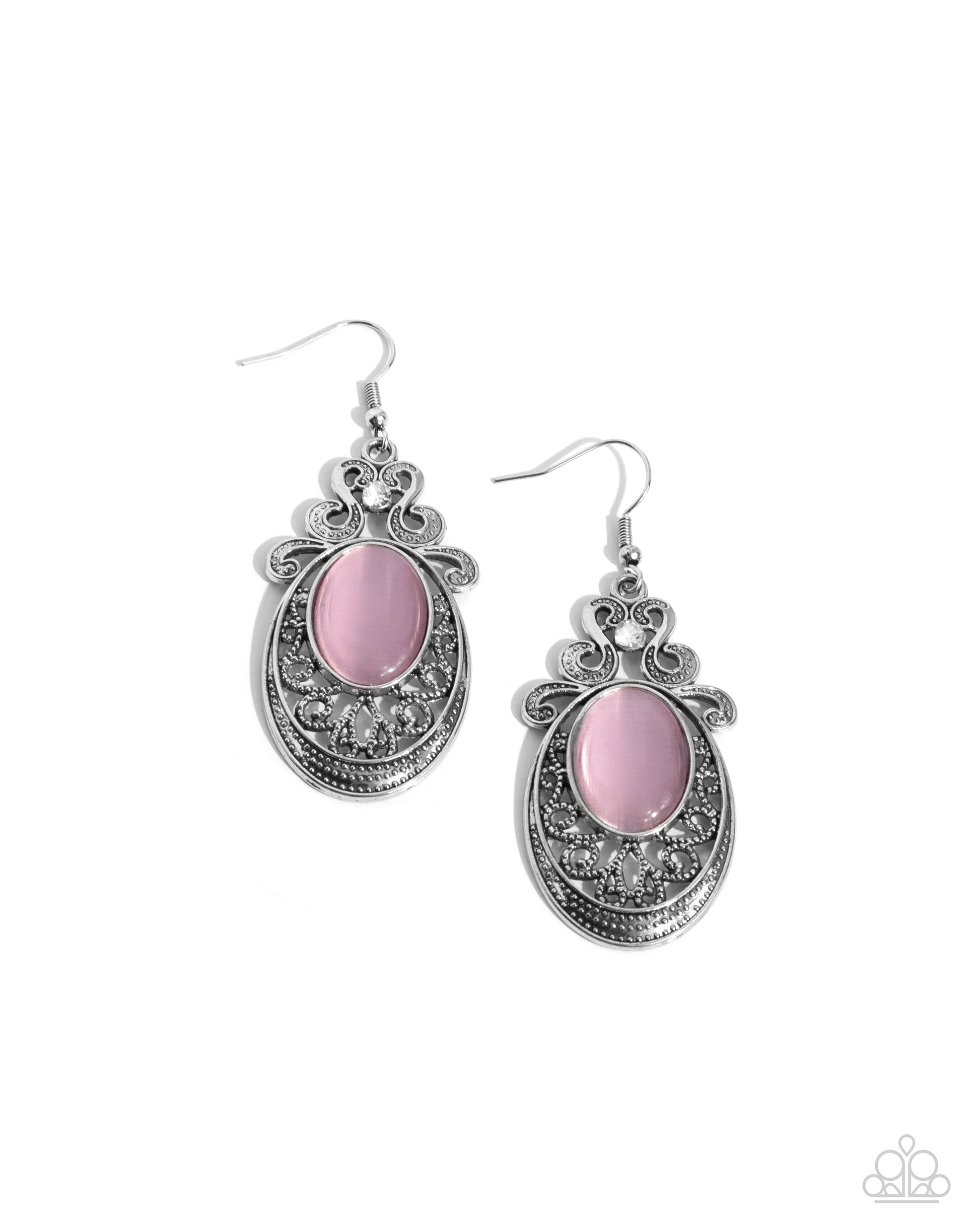 Topped with studded silver filigree and a solitaire white rhinestone, an oval silver frame is adorned with studded vine-like filigree that fans out from the bottom of a whimsical pink cat eye's stone for an enchanted fashion. Earring attaches to a standard fishhook fitting.