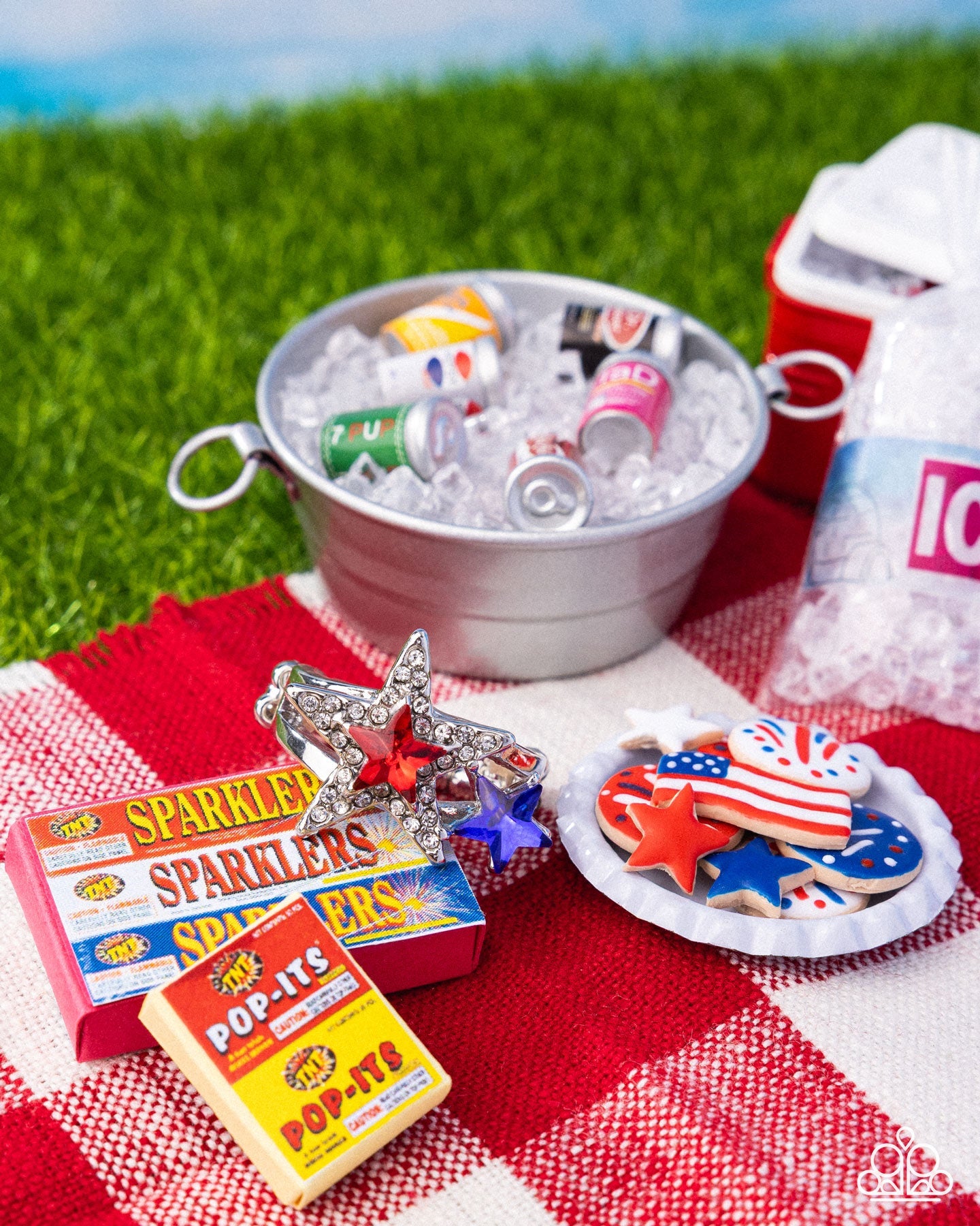 Two stacked star motifs create a dazzling patriotic sparkle atop the finger. A vibrant red and blue gem star shimmer together, with the red star haloed with dainty white rhinestones, finishing off the look with added dimension and sparkle. Features a stretchy band for a flexible fit.