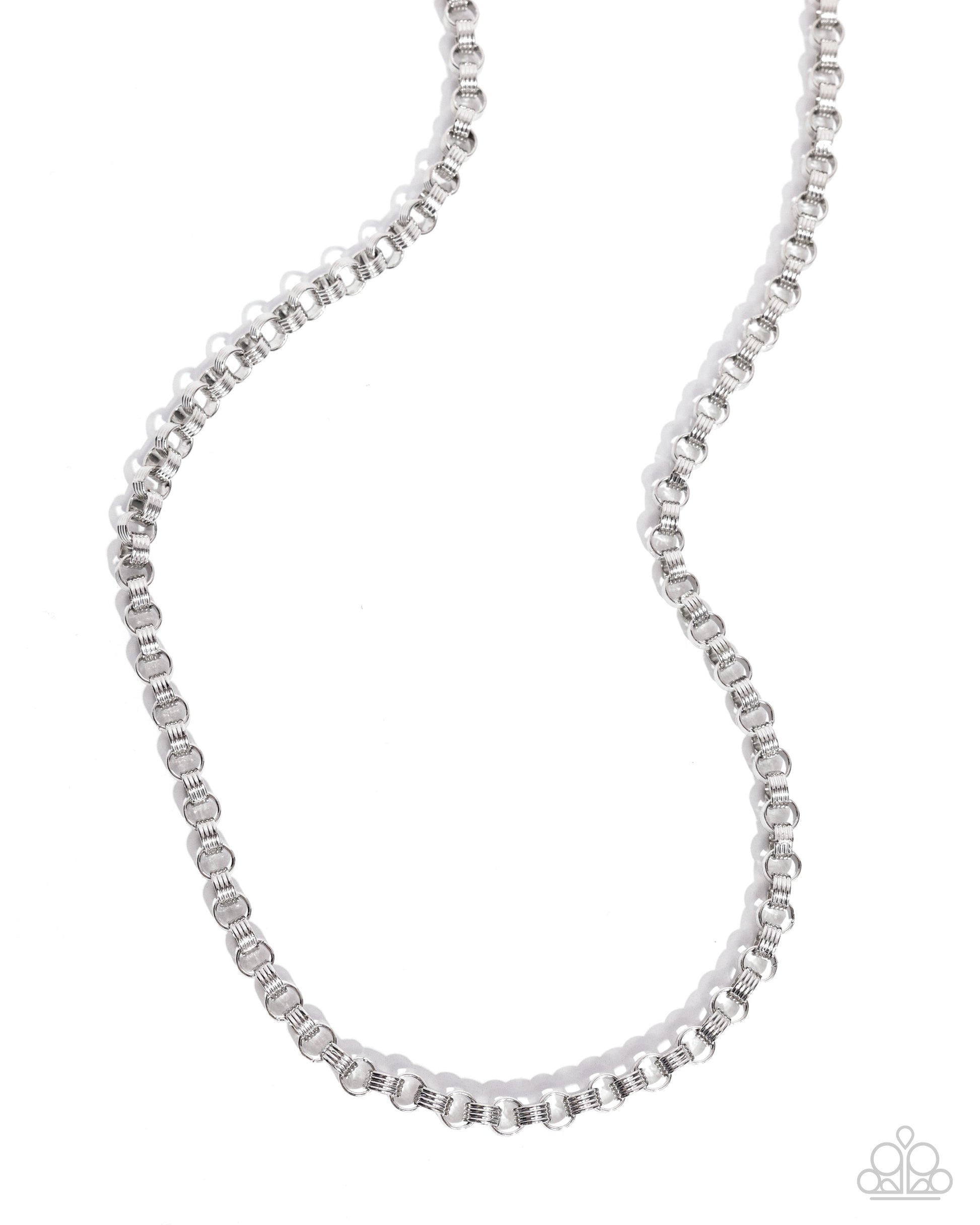 A fused collection of silver rings connects to elongated silver rings, alternating around the neckline for an attention-grabbing statement. Features an adjustable clasp closure.