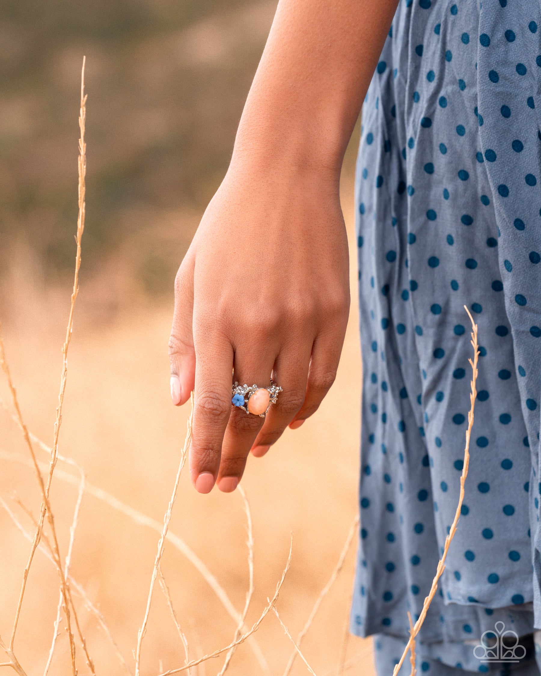 Intricate silver botanical-inspired vines spread across the finger with a vibrant peach oval stone at its center. Delicate floral accents, including a dainty blue blossom, and shimmering light peach rhinestones, embellish the sides, adding a pop of color and texture to the whimsical design. Features a stretchy band for a flexible fit.