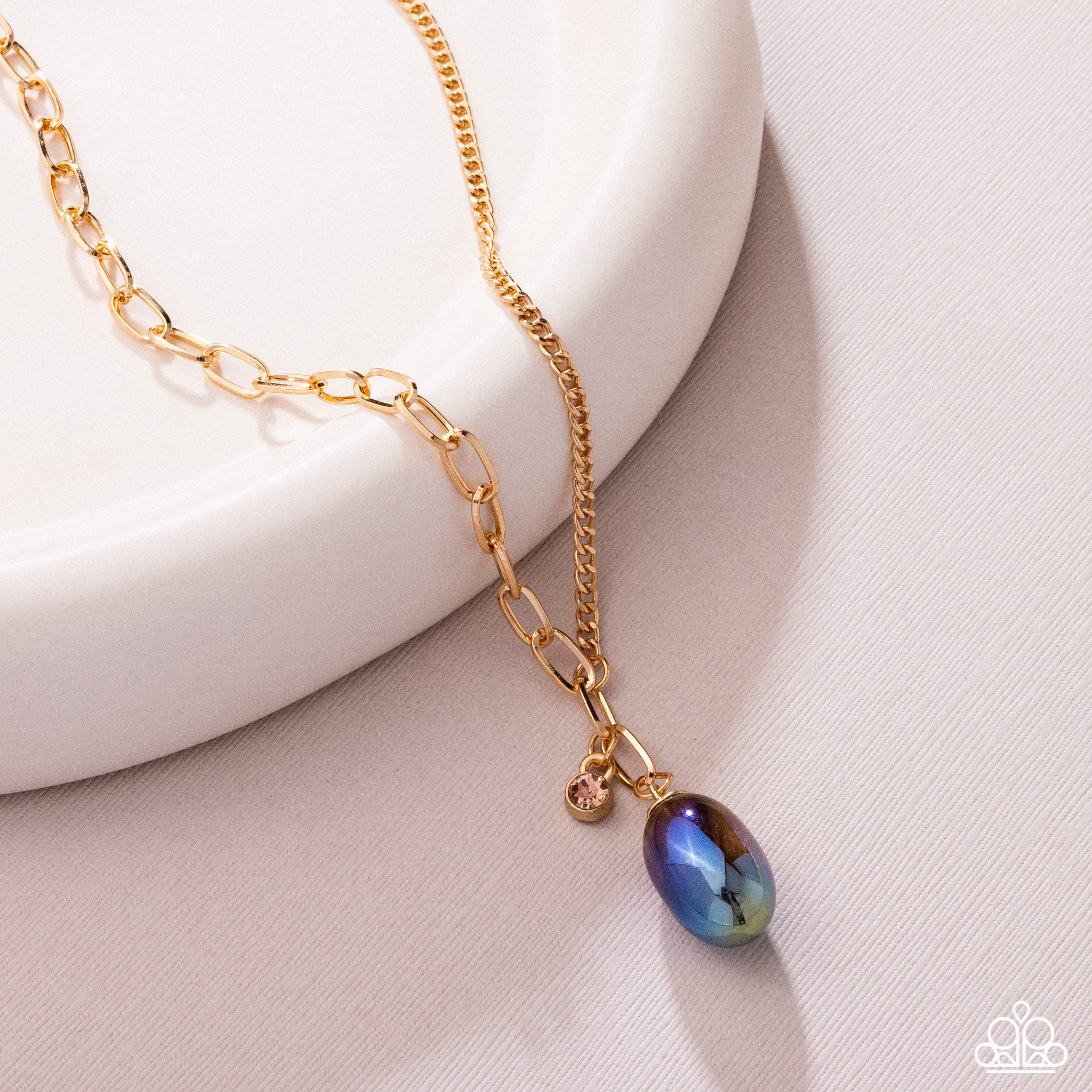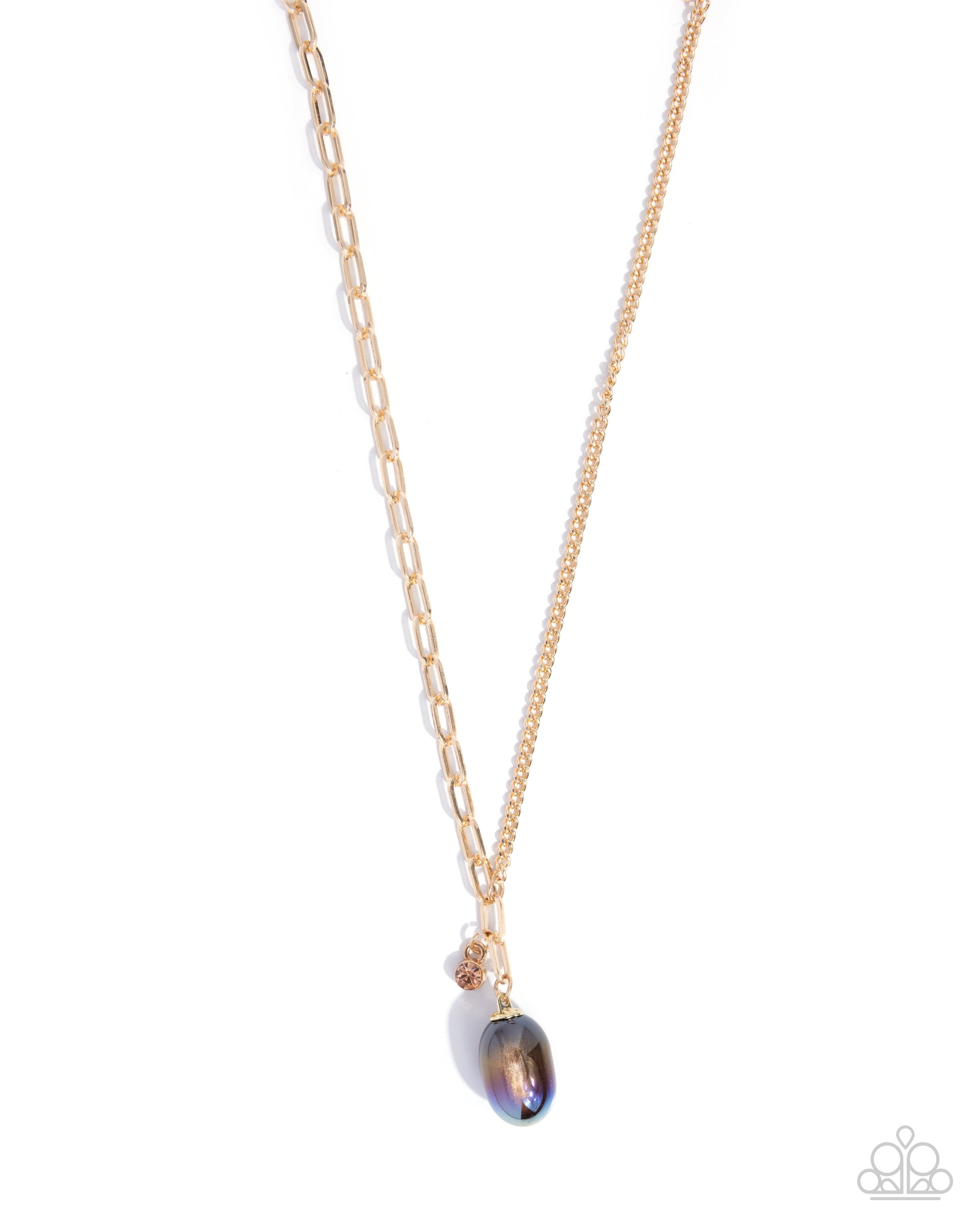Intersecting a gold paperclip chain, a classic gold chain completes the neckline-encircling display, giving way to a solitaire light peach rhinestone in a gold fitting and an ombré-splashed oval pendant that fades from brown to purple for an adorably abstract display. Features an adjustable clasp closure.