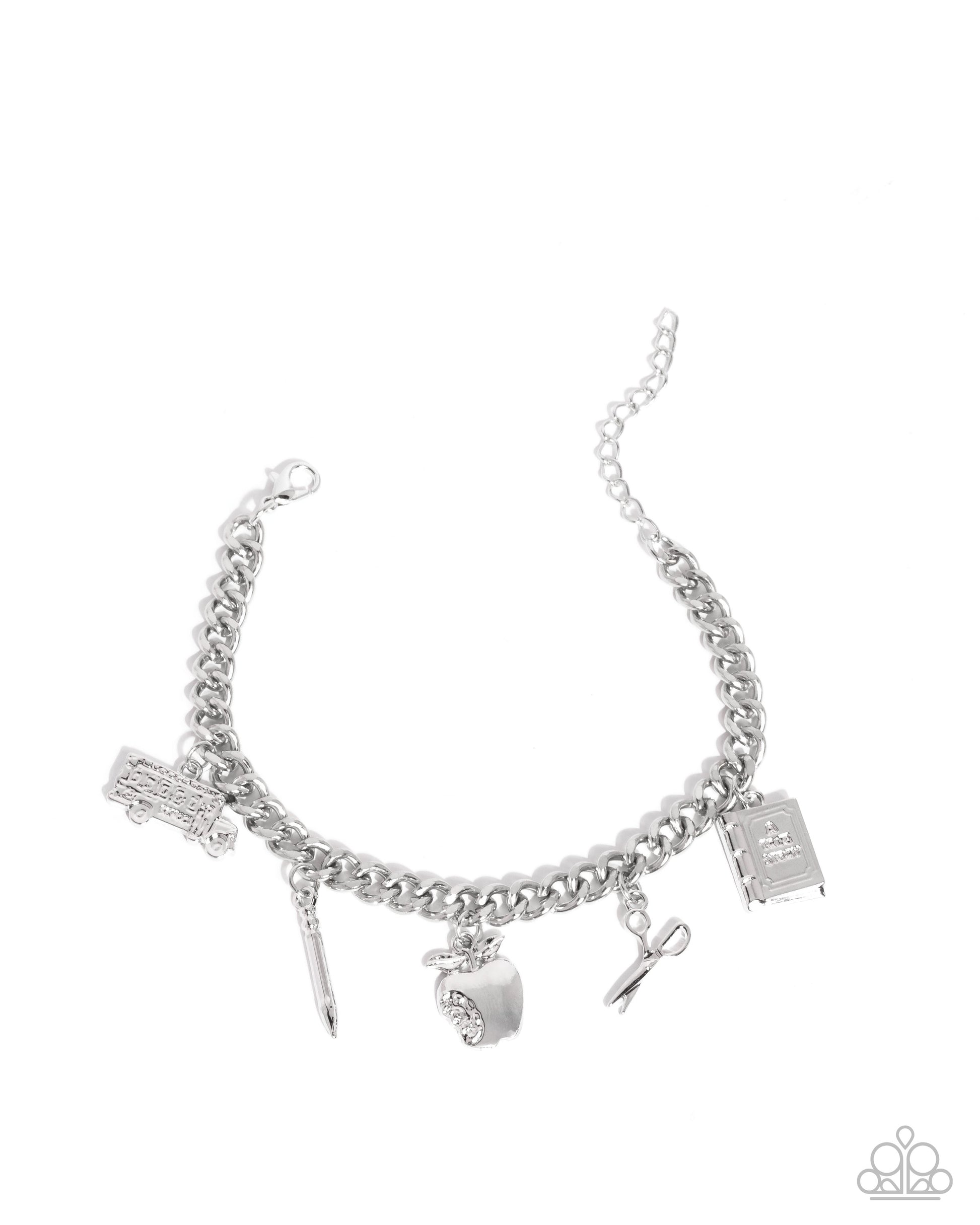 Swaying along a silver curb chain, a collection of monochromatic silver charms including a school bus, a pencil, a pair of scissors, a book, and a bitten apple with a hammered indent creates a striking school-inspired statement. Features an adjustable clasp closure.